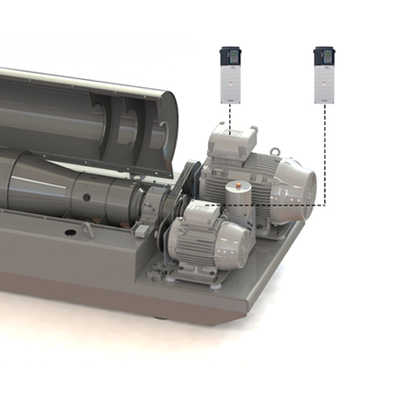 Electric motor with frequency converter control; bowl drive via V-belt. Electric motor with frequency converter control; generation of the differential speed with planetary gears; Power supply to the scroll frequency converter via intermediate circuit; Scroll speed dependent on bowl speed