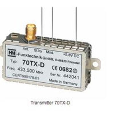 The UHF mini transmitter 70TX-D is one of the smallest crystal stabilized transmitter modules in the 500mW class. A wide voltage range and its low power consumption combined with the small size makes the module ideal for portable and mobile applications.
