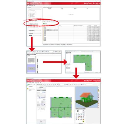 Room modeling: Fast and intuitive software for modeling planes. Determination and documentation of dimensions, measurement of certain spots and the control of complex conditions. As soon as ground or ceiling plane is created all other planes can be created with the useage of the prism function. Each plane or opening can be allocated to a component. Interfaces: Export of quantity analytics via CSV files. Geometries can be exported in Collada and DXF/ DWG files to CAD programms. E.g. for room design, bathroom and building planning. Tachymeter function: The tachymeter function generates additional laser measurement spots to the automatic aquisition programms. This add-on simplyfies the aqusition of planes and areas and enables more flexibility.The positioning of the laser can be effected with the integrated remote control of the HottScan room modeler or by manual positioning.
