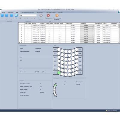 HTA Autosampler Manager is the software dedicated to manage HTA autosamplers. The software allows to perform almost all operative tasks that are available from autosampler touch screen or keypad such as creation and editing of the instrument methods, sample list generation, sample run..
