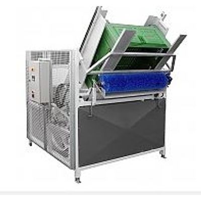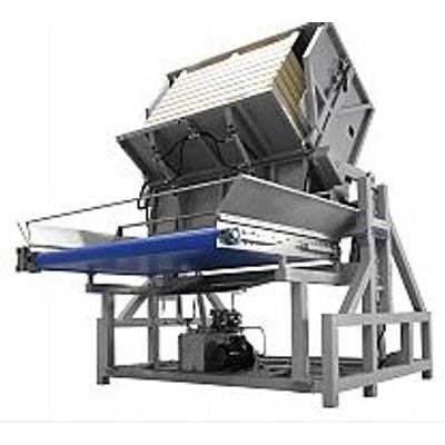 Dry pallet unloader works as a tipping device for emptying boxpallets with produce requiring gentle handling.