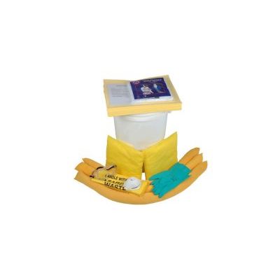 Chemical Spill Kit designated as yellow in colour, designed to absorb aggressive and non-aggressive liquids such as acids, caustics, oil coolants, solvents, water and solutions. Fast acting with high absorbency rates for larger chemical spills down to bench top laboratory situations. Contents include Plastic Drum, 2 Socks, 15 Pads, 1 Disposal Bag and 1 Instructions & Contents Card.