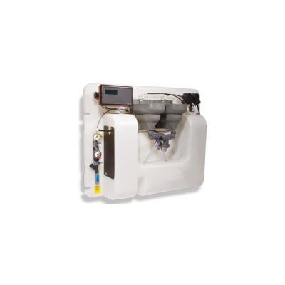 The model 590 solid dissolver provides diluted solution of one product held in an integrated reservoir, ready for on demand pumping when indicated by the system controller. The system provides a backup sump/float system to prevent spills in case of an overflow condition.