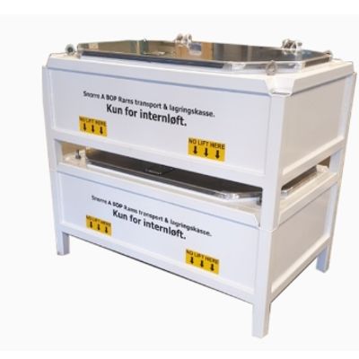 In the corner of the Storage boxes are installed RUD Eyes for internal transport. Boxes can be transport with use of Forklift truck. Position for placing forks is clearly marked on the sides.Boxes are produced with carbon steel and painted according to NORSOK standard. Water sealed aluminum cover plate can be fully open to protect hinges.Manual installed locking bar ensure that Bop Rans will stay is safe position during transport operation.Corner parts of the storage box is design to allowed vertical stacking, with maximum of 3 boxes.