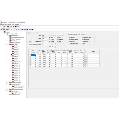The basis for WinSprink is the time-tested and proven calculation core. Tree and loop typed systems can be calculated. The input of data is made by an input tree view control which can be compared with Windows Explorer. The item which is to be processed can be selected directly from the tree (e.g. range pipe). The data for this item will be shown on the right-hand side in a table. Thus, finding the items and changing them is easy and fast.