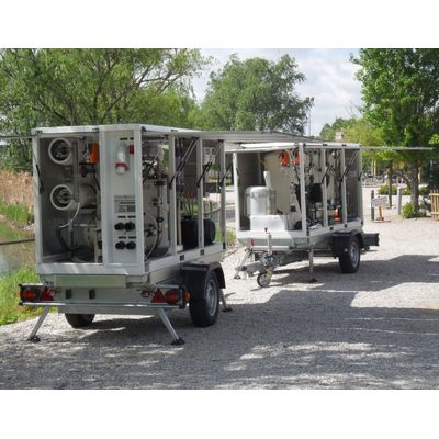 Mobile units able to be towed by various types of vehicles. Two module system with sand and active carbon filtration, microfiltration, reverse osmosis for sea water,remineralization and disinfection. Cleaning In Place (CIP) system on board. Completely automatic.