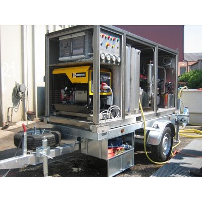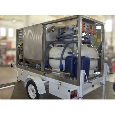 Mobile unit able to be towed by various types of vehicles. Sand filtration, microfiltration, reverse osmosis for sea water and disinfection. Cleaning In Place (CIP) system on board. Completely automatic.