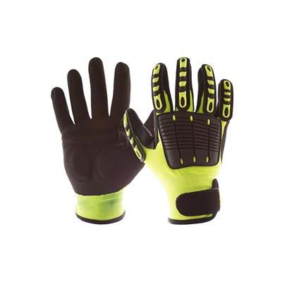 IMPACTO Back Tracker Anti-Impact Glove with Back of the Hand Protection. Heavy duty TPR on back of fingers, thumb and back of the hand protects against bruises and bumps. Antislip nitrile dipped palm offers excellent gripping. Sewn-on palm pad protects from impact. Reinforced patches in the thumb web area assure long wear and protection. High-visibility elastic neon green nylon laminated fabric. Adjustable hook and loop closure.
