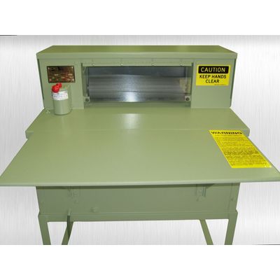 The IS 16 models do not require any physical mounting to the floor. The IPS 16-RC is equipped with a fixed cut system. This machine is equipped with two limit switches for operational safety. The first switch is located behind the Plexiglas shield located above the conveyor. If any object thicker that the opening goes under the shield it will stop all motors. The second switch is located beneath the hood of the rotating reel cutter. If the hood is lifted during operation the machine will stop all motors.