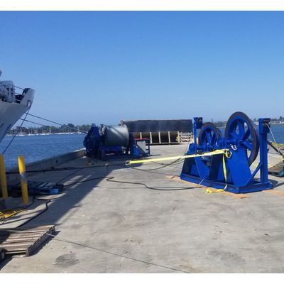 InterOcean Systems can perform winch maintenance services such as unspool, clean, lubricate, and re-spool. Our 40HP cable reel has a built-in, programmable levelwind and is capable of handling over 15,000 meters of cable weighing up to 32,000lbs. Our tensioning rig (bull wheel style) is capable of providing up to 10,000lbf (44.5 kN). Tensions are adjustable on the fly to ensure that your cable is spooled properly with a ramp-up and ramp-down of tensions.