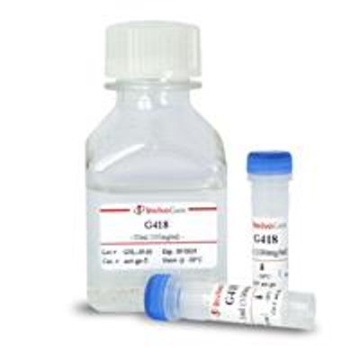 G418 also known as G-418, G418 sulfate or Geneticin is an aminoglycoside antibiotic produced by Micromonospora rhodorangea.G418 blocks polypeptide synthesis by inhibiting the elongation step in both prokaryotic and eukaryotic cells.Resistance to G418 is conferred by the Neomycin resistance gene (neo) from Tn5 encoding an aminoglycoside 3` phosphotransferase, APH 3` II.Selection in mammalian cells is usually achieved in 3 to 7 days with concentrations ranging from 400 to 1000 µg/ml. Cells that are dividing are affected more rapidly than non-dividing cells.