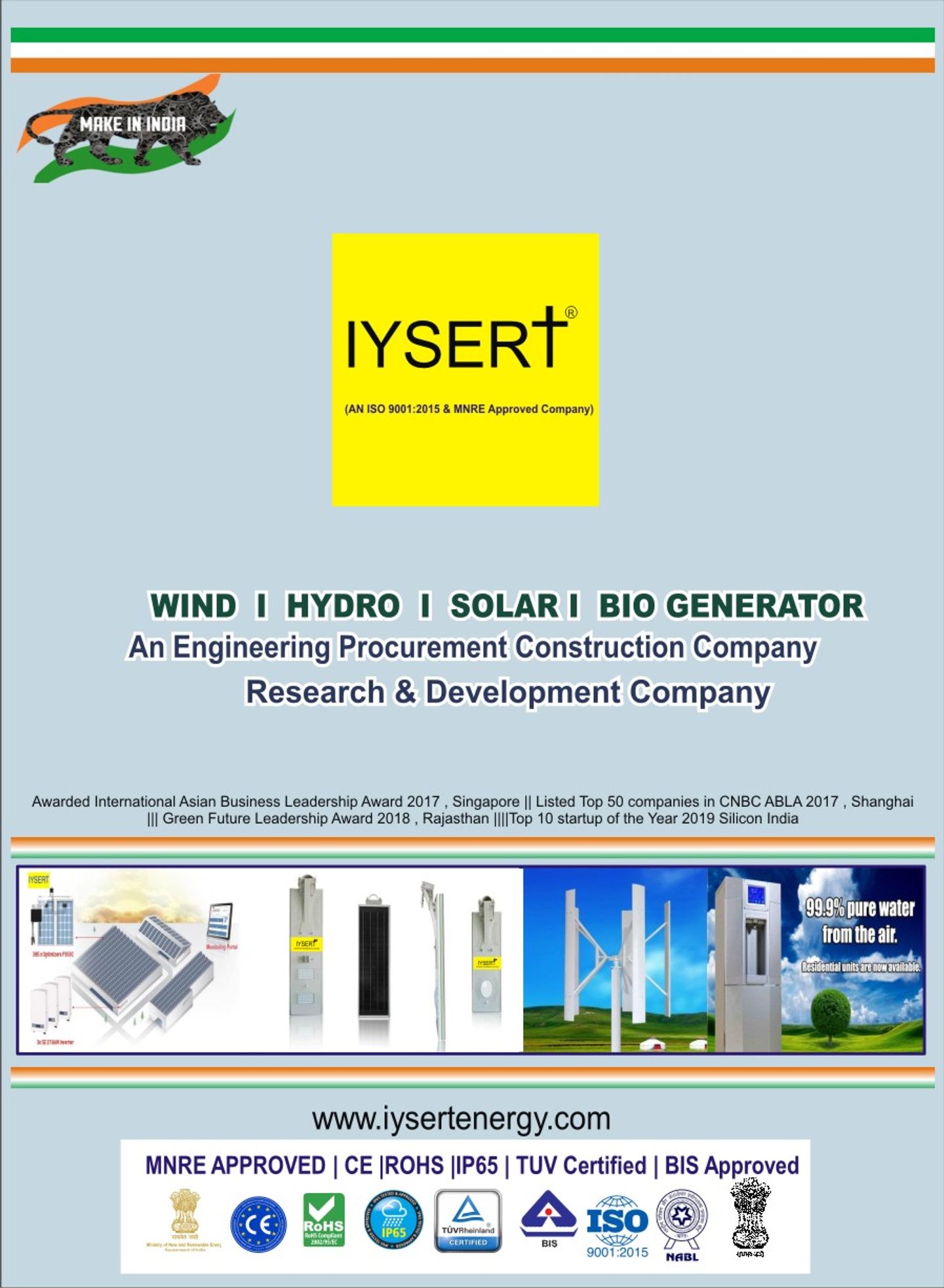 Iysert Energy Research Private Limited is an ISO 9001:2015 & MNRE Approved Channel Partner Company, is the Manufacturer of Portable Solar Technology, Vertical Turbines & Bio Waste Technology with its world class manufacturing unit facility in Rajasthan. IYSERT has successfully set up a world class state of art 20 MW photovoltaic crystalline solar module manufacturing unit in Rajasthan & this is the first phase of the company with rapid expansion plan, subsequently company has plan of expanding its capacity 45 MW shortly. We manufacture the highest quality of photovoltaic crystalline modules for both off grid and on grid applications as well as Wind & hybrid system. Our customers range from small local installers and distributors to global EPC contractors. Our Company is also into application & development of the products.The current range includes domestic, commercial and industrial solar powered system.