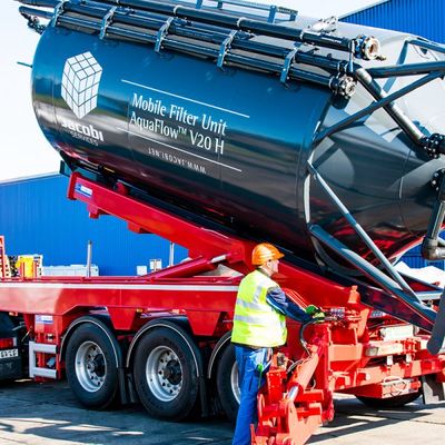 The AquaFlow™ V20 H mobile filter unit (MFU) is an industrial adsorption filter specially developed and built for the treatment of water such as groundwater remediation, landfill leachate treatment, wastewater, potable water and purification of process liquids. One AquaFlow™ V20 H adsorption filter can treat up to 80m³/h/filter.