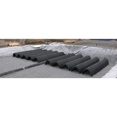 The JFC HydroChamber is an arched chamber attenuation system designed specifically for building underground storage tanks for stormwater runoff in attenuation and soak away applications. Its superior design makes it suitable for building storage tanks under HGV trafficked and car park areas as well as non-trafficked areas (e.g. green amenity areas). JFC HydroChambers have many advantages over other similar products including BBA certification for HGV loading, superior structural strength, silt management, maintenance and inspection capabilities and cost effectiveness. The HydroChambers are manufactured from high density polyethylene plastic and are backfilled with 35/50mm clean washed crushed stone. The corrugated arch shape of the HydroChamber provides excellent structural strength as shown in independently witnessed field tests where the chambers were exposed to loads 3.5 times greater than that expected in service.