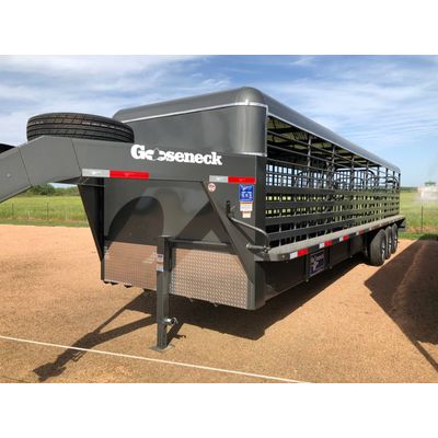 32` x 6`8" steel trailer, Gray Metallic, Metal top, Three 7k spring axles with 12 ply tires, Electric brakes on all axles, Four 1X3 tube sides, Split tailgate, 2 cross gates, Full escape door, Cleated rubber floor, Gravel guard, Spare tire.