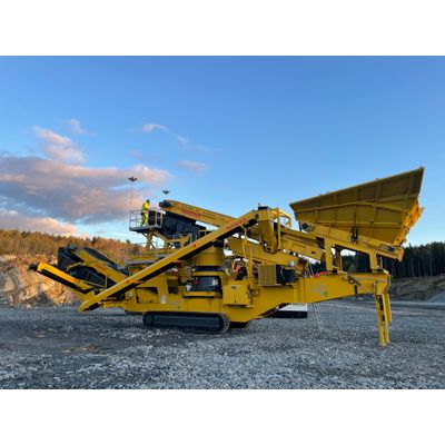 Performance highlights: Feed size up to 600 mm (24”). Independent double deck vibrating pre-screen 2.300 x 1.000 mm (7’7" x 3’3"). Feed opening 1.100 x 700 mm (44” x 28”). C.S.S. min. - max. 45 - 160 mm (1 3/4” - 6 1/3”). Capacity up to 400 tonnes / hour. Hydraulic sliding frame for service access under the feeding and scalping unit. Optional single deck after screen 2.800 x 1.200 mm (9`2" x 3`11"). Intake hopper suitable for wheel loader and excavator, 5 m³ (6,5 yard³). Hydraulic gap adjustment to safely prevent clogging. Smart sequential auto start/stop from remote. Ability to track while producing. 2 speed track drive. Extensive option list to configure to your application.