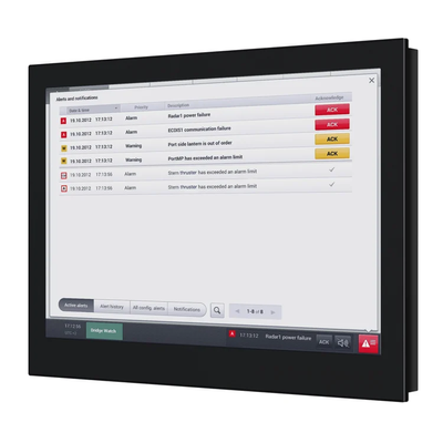 The K-Bridge conning display makes key information easily available for efficient monitoring. It is a screen based information system. Sensor input data and corresponding orders (set points) collected from individual sensors and instruments are logically grouped and presented on a screen for easy viewing from the primary workstations up to a distance of 2 meters from the screen. The conning information display system uses graphic display technique and locates the data inputs appropriately around and on a symbol illustrating the configuration of the ship. Bridge and watch alarm system is available as an integrated function of the conning display, with clear alarm message display and acknowledgment functions at every conning display.