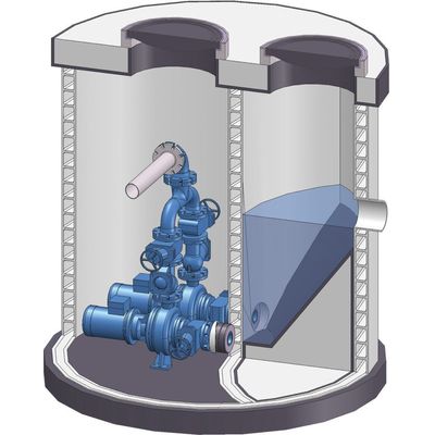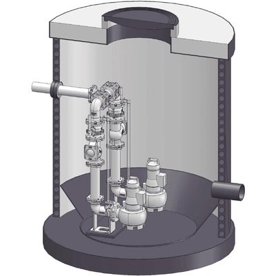 Pump station for greater inlet depths: Robust reinforced concrete shaft. Covers up to class D (truck passable). Pumps with foot installation. Single or double unit. Armatures in DN 40 or DN 50. Armatures in cast iron or stainless steel. Inklusive buoyancy control. Fully electronic control unit. External column or building installation of the control unit. Flushing connection (optional). Vacuum breaker (optional).