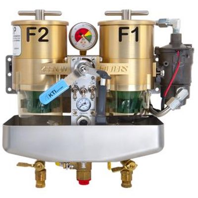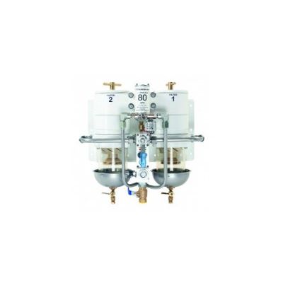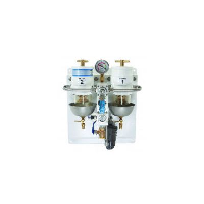 The dual filter package comes complete with the FilterBOSS COMMANDER mounted on a pre-drilled panel with two Racor 1000MA filters and the integrated Reverso fuel pump. All the installer needs to do is mount the dual filter package, connect the fuel inlet and outlet lines, install the early warning panel and connect the pre-assembled wiring harness. The filters and pump are connected with stainless steel tubing and tested for leaks. The fuel pump is mounted in front of the filters to save space.