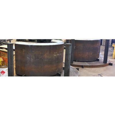 This industrial bearing shell was custom fabricated by Kubes Steel, the heavy shell plates are brought in cut-to-size where we start with the press brake to form them into half cylinders. After forming the plate, our welders take over to assemble the shell halves and prepare them ready for the machining process and ready .