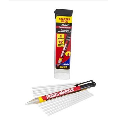 TRADES-MARKER has the marking versatility of a paper-wrapped grease pencil combined with simple push-button advance that helps reduce cost and waste. This refillable, all-surface marker leaves a wear-resistant mark and is safe for all surfaces eight colors to meet all your marking needs.