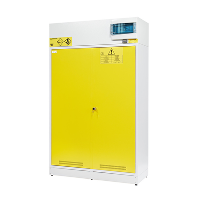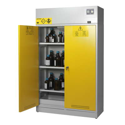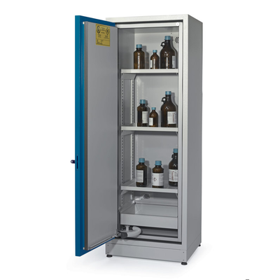 Safety cabinet with aspiration and filtration system for the storage of 160 litres of chemical products, acids and bases certified according to the following standards: EN 61010-1, EN 16121, EN 16122, TEST PPP 52125A. CE mark. TÜV certified.