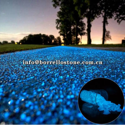 High Performance Glow Stones For Terrazzo,Concrete And Asphalt Projects. Super grade brightest and longest glowing time 8-10 hours. Charge time 10 minutes of daylight. Sizing: 2-4mm, 4-8mm, 10-15mm to max 40-60mm. Glow color: Blue-Green, Sky-Blue, Yellow –Green , 3 colors supply. Glass type, resin type. Glow aggregate, pebble, sand, powder.