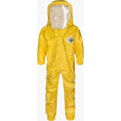 Chemical protective rear-entry encapsulating suit with 20mil PVC visor and supported by Permasure. EN Type 3 liquid jet spray and Type 4 liquid spray chemical protection.