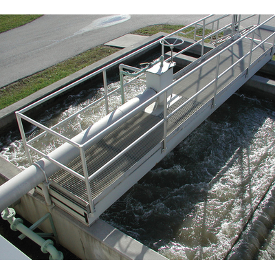 The Aeroductor grit chamber effectively removes inorganic grit from the influent flow in a controlled, aerated environment. Air is injected into the grit chamber, circulating the contents and causing lighter organics to remain in suspension while heavier grit is scoured, washed and collected at the bottom of the tank. Settled grit is periodically removed by an airlift pump. The air-grit slurry mixture is lifted to the head box where the air is vented and the liquid/grit mixture is directed to the Grit Classifier for separation and dewatering.