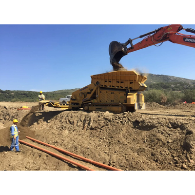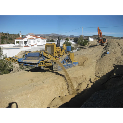 Grub 2000 is a self-loading mobile crusher designed specifically to operate along the side of trenches. This model collects and crushes the excavation waste material, composed of rocky material of various granulometries, soil, and debris. The fine material produced is discharged into the trench for the creation of the bedding and/or for back-filling the pipe, thanks to the retractable transverse conveyor belt with which the machine is equipped.