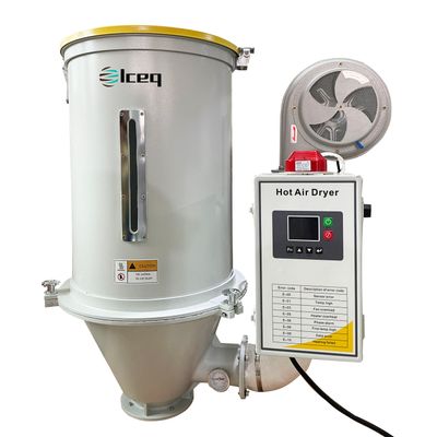 The LCEQ Hopper Dryer is designed for drying pellet materials within the plastic processing industry. Fabricated from stainless steel, this equipment ensures zero contamination risk and is available with a drying hopper capacity ranging from 12 kg to 1000 kg. It supports a maximum temperature of 160 degrees Celsius, catering to the specific needs of diverse plastics. The device features a digital temperature controller, overheating, and overload protection systems, and is fitted with an aluminum base. Optional enhancements such as a hot air recycler and air dust filter extend its capabilities. Air heated by an internal heater is circulated through the hopper by a blower, efficiently removing moisture through the top air vent. The system includes a temperature sensor for real-time monitoring, enabling precise temperatures and settings control via an integrated controller, which manages variables like drying time and motor operation. This robust dryer is pivotal for achieving efficient, consistent drying outcomes in plastic production.LCEQ - All-in-One Dehumidifying Dryer for Plastic Processing
