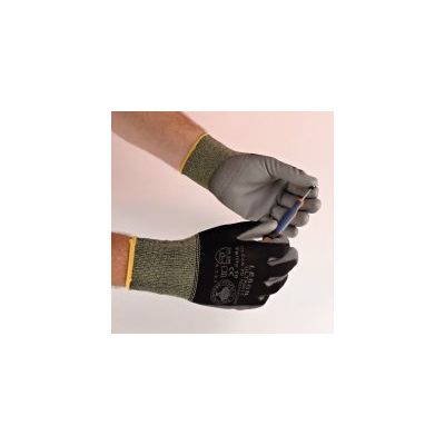 Automotive manufacturing and supply industry. Metal manufacturing and processing industry. Engineering industry and industrial maintenance. Assembly works. Building and public works. Logistics, Seamless knitted glove (gauge 13) in 100% grey texturised polyamide. Black texturised PVC coating on palm and fingertips. Elastic wrist.