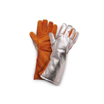 Welding glove, palm and thumb in heatproof split leather. Back of glove and back of thumb in 100% aluminized para-aramid fabric. Glove fully lined with 100% wool fleece. 40 cm length. 100% para-aramid sewing thread.