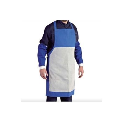 100% fireproof cotton apron, blue colour. Reinforcement on the belly in natural cow split leather. Closure by crossed straps with quick coupler. Packaging; 10 per packet - 20 per box Key strengths ; Adjustment. Comfort ; Resistance .
