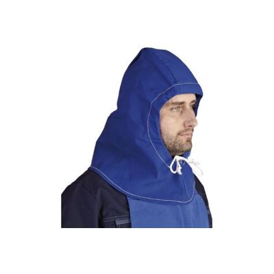 100% fireproof cotton canvas hood, blue colour. Foam reinforcement on the head. 100% para-aramid sewing thread.