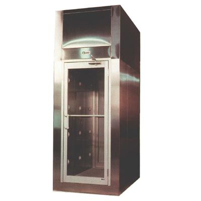 304-2B 16 gauge stainless steel construction with doors - heavy duty anodized aluminum, 3/16" safety glass. Available with option of left or right door swings. Doors have magnetic interlocks. Operation can be changed from 1 way to 2 way without changing electrical parts Outside dim, - H: 120", W: 48", Door-to-Door: 48". Inside dim, W: 36", Door-to-Door: 441T, H: 84". 5` and 6` width configurations available. Standard operating time 0 -120 seconds. Air Shower delivers moving air at approx, 7500 fpm from 30 adjustable plastic louvers located in ceiling and sidewalls. Return air grilles located in the walls of air shower.