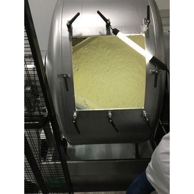 Cryogenic Mixing at -120°C < T < -80°C is possible with special adaptations to inlet, outlet and drum. The rotary drum mixer and product is kept at low temperature by using liquid nitrogen in the dosing cabinet, inlet, mixing drum, and outlet. Parts of the industrial mixer are double walled in this configuration. With a PID control loop and solenoid valve for Liquid Nitrogen the set temperature is controlled.