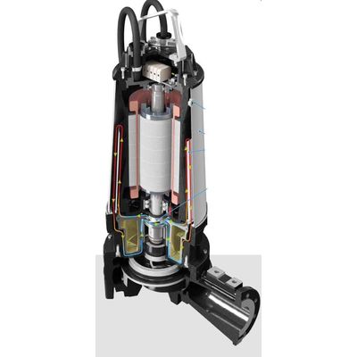In DRY version models, the motor is cooled by a water-glycol mix circulating in a special closed circuit. The mix is recycled through the pump by an axial impeller rigidly mounted on the shaft and the specially designed steel double jacket which provides the necessary heat exchange between the motor and the external environment.