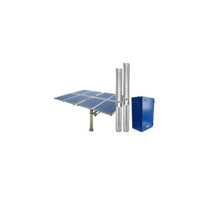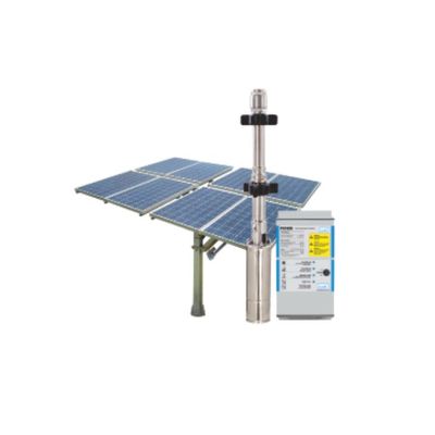 RANGE OF PERFORMANCE: Maximum flow : 780 m3/day, Maximum head : 57 metres, Rating : up to 5 HP. OPERATING CONDITIONS: Ambient temperature : +50°C, Liquid temperature range : 0°C to +80°C, Water pH : 6.5 - 8, Sand content : 25 g/m3. FEATURES & BENEFITS: Highly durable Stainless Steel construction of pump end, The high efficient DC motor is designed According to the permanent magnet principal with separate electronics unit, The permanent magnet motor featuring a consistent higher efficiency within power range compared to a conventional asynchronous motor, High efficiency solar photovoltaic panels with a service life of minimum 20 years, Robust design Galvanized steel mounting structure for long life, High technology automatic controller with dynamic MPPT (Maximum Power Point Tracking) control method, The controller offers complete protection against under and over voltage and dry run protection for the pump.