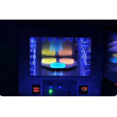 Certified compliant with ICH guidelines under option 2. Includes 16 (367 nm) UVA and 16 visible lamps. Carousel for liquids and a turntable for solid samples. Recessed magnetic stirrer. Digital timer allows for timed irradiation from a few seconds to 99 hours. UVA/VIS power meter. Bulkhead connector for gases, safety goggles and a safe exhaust system are also included. The temperature control range is from 25 to 45 Celsius. Certification includes mapping of energy distribution in the chamber.Accessories - Lab Grade Glassware