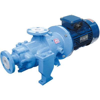 Horizontal, sealless PFA Lined centrifugal pump with permanent magnet drive system, no mechanical seal. Close-coupled drivers are conventional drivers mounted directly to pumps frame. No base, coupling or guards are required for this mounting style.