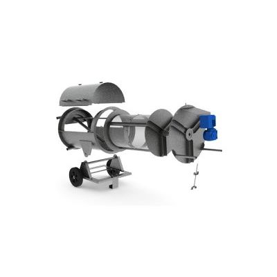 MAHR MASCHINENBAU´s KLAERABELLA is a mobile sludge-dewatering-drum designed especially for smaller sewage treatment plants. It can easily be moved and operated by one person. The operation is simple but highly efficient: The ratio capacity/efficiency can be adjusted simply by changing the drum´s inclination angle and rotation speed. The dimensioning is according to the client´s needs!