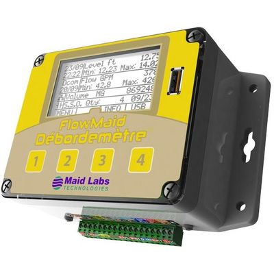 FlowMaid is a small open channel flow meter, which uses any level sensor to calculate flow from on a selection of 11 flow formulas. Each second, it records level, flow, volume and discrete events. Years of data can be recorded before filling its memory. Data can be downloaded through a USB key, WiFi, Internet or cellular modem. It automatically generates CSV reports of SSO events. The only requirement is to enter the level of the overflow pipe, its diameter, material, and angle. Every event shows start and end time, duration, average flow and volume lost, with daily totals. The relay outputs can be remotely activated or based on events such as high levels or extreme flow.