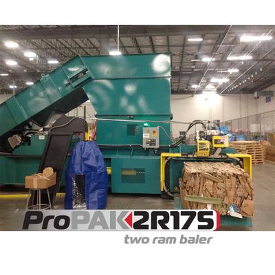 The Model ProPAK 2R175 is a fully automatic 2 RAM baler. The extra large feed hopper is ideal for oversize materials, i.e., refrigerator boxes, gaylord containers and large screen TV boxes. A Bale Separation Door assists in eliminating unwanted contaminated bales along with providing relief for oversize bales. “Pre-conditioning” is unnecessary due to a progressive shear blade design that is replaceable and made of hardened and ground tool steel. Using an Accent 470 wire tie system the bale is tied around the short dimension resulting in wire savings and better bale integrity during transportation. This adds up to time and money savings!