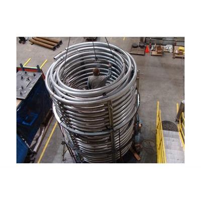 Marks Brothers manufactures pipe coils for internal heating or cooling of vessels with continuous CNC-rolling and automatic orbital welding of seams. Each pipe is orbitally welded into the coil as it is rolled into a coil at the specified diameter and pitch. This process ensures x-ray quality welds, provides a consistent radius and pitch, dramatically reduces material waste, and saves significant labor costs compared to trimming and fitting pre-rolled pipes into a coil. Spot x-ray, 100% x-ray, hydrostatic testing, and documentation is provided based on specific job requirements.