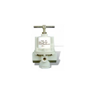 The Type 37 regulator is specifically designed for applications that require large flow capability and accurate pressure control. This regulator offers low droop, high accuracy, and fine adjustment sensitivity. The use of a Bellofram rolling diaphragm provides greater sensitivity and improved accuracy. The Type 37 offers a balanced pintle,which minimizes output pressure changes caused by fluctuations in supply pressure. Careful design and quality materials throughout assure long, trouble-free operation. The rugged die-cast aluminum housings are pressure tested to assure safe operation, and are designed to withstand harsh and abusive environments. This durability is attributed to a chemical conversion coating of all cast components and a vinyl paint finish. With a maximum supply pressure of up to 400 PSIG/27.6 BAR and output ranges up to 125 PSIG/8.6 BAR, the Type 37 can achieve flow rates of well over 110 SCFM. It can be panel or pipe mounted.