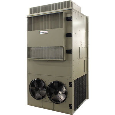 The Marvair MGH series of vertical exterior wall mount air conditioners are specifically engineered to provide efficient cooling solutions for electronic and communication equipment shelters. These units are designed to manage the high internal heat loads frequently observed in such environments, with capabilities to operate effectively even when external temperatures fall below 15°C (60°F). Employing the non-ozone depleting R-454B refrigerant, the MGH series offers environmental consciousness alongside performance. An optional factory-installed economizer allows for cooling via outside air, enhancing temperature control and reducing energy costs while extending the life of cooling components. Built to meet stringent safety and efficiency standards, the air conditioners comply with UL/CSA 60335 standards and ANSI/ARI Standard 390. Capable of cooling capacities ranging from 90,000 to 180,000 BTUH (7.5 to 15 tons), the units feature dual compressors for high efficiency and reliability, fulfilling the demanding needs of commercial applications.