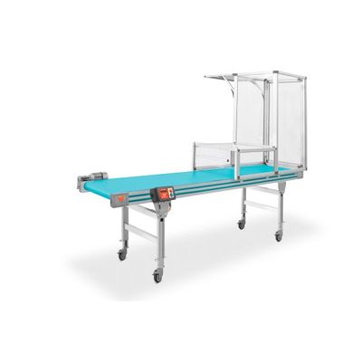 Anodized ALU profile structure (thickness 15 Microns) Alloy 6060. The standard conveyor configuration features h 80 mm side panels and switch/motor protector + cable and plug. Sturdy cut-proof, oil-proof belt in black Polyurethane; vulcanized belt joint. Minimum and maximum temperature resistance of belt: from -30 to 90°C.