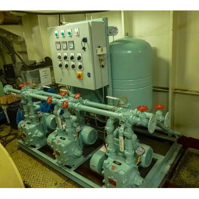 Megator marine pressure sets are compact self-contained units, incorporating the highly successful sliding-shoe pumps, hydraulic accumulator, inter-wired control panel and all interconnecting piping assembled on a fabricated steel frame. On-board installation only requires piping connections to suction and discharge manifolds, connection of main electrical supply to control panel.