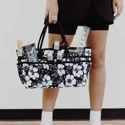 The meori Large Portable Craft Tote stores and organizes sewing, quilting, paper crafting, and art supplies. The lightweight, durable construction is designed for on-the-go organization and style. The thoughtful design means the tote stays upright, holds personal essentials like water bottle, cell phone and keys and makes carrying heavy loads easy and comfortable. The stylish design makes this tote is cute enough to use as a fashion handbag. We partnered with designer Alli K. to create a black and white Modern Flower Power version of this tote. Also available in meori’s Azure Blue.